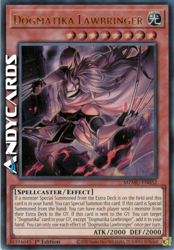 If a monster Special Summoned from the Extra Deck is on the field and this card is in your hand: You can Special Summon this card. If this card is Special Summoned from the hand: You can have each player send 1 monster from their Extra Deck to the GY. If this card is sent to the GY: You can target 1 "Dogmatika" card in your GY, except "Dogmatika Lawbringer"; add it to your hand. You can only use each effect of "Dogmatika Lawbringer" once per turn.
