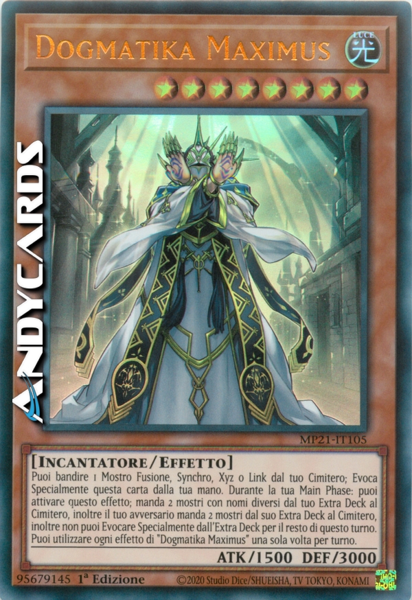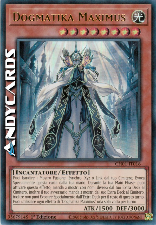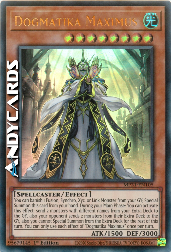 Puoi bandire 1 Mostro Fusione, Synchro, Xyz o Link dal tuo Cimitero; Evoca Specialmente questa carta dalla tua mano. Durante la tua Main Phase: puoi attivare questo effetto; manda 2 mostri con nomi diversi dal tuo Extra Deck al Cimitero, inoltre il tuo avversario manda 2 mostri dal suo Extra Deck al Cimitero, inoltre non puoi Evocare Specialmente dall'Extra Deck per il resto di questo turno. Puoi utilizzare ogni effetto di "Dogmatika Maximus" una sola volta per turno.