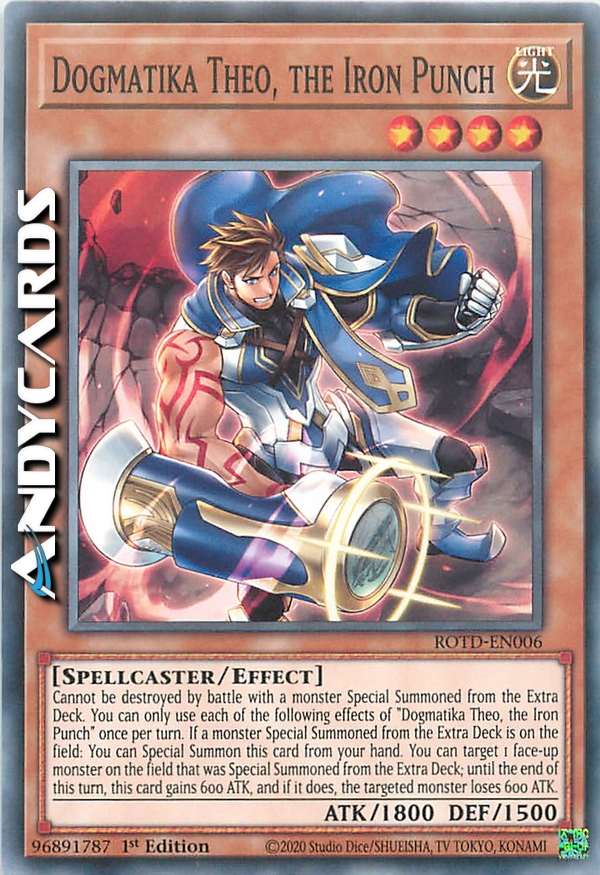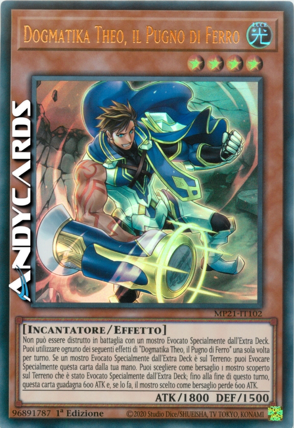 Non può essere distrutto in battaglia con un mostro Evocato Specialmente dall'Extra Deck. Puoi utilizzare ognuno dei seguenti effetti di "Dogmatika Theo, il Pugno di Ferro" una sola volta per turno. Se un mostro Evocato Specialmente dall'Extra Deck è sul Terreno: puoi Evocare Specialmente questa carta dalla tua mano. Puoi scegliere come bersaglio 1 mostro scoperto sul Terreno che è stato Evocato Specialmente dall'Extra Deck; fino alla fine di questo turno, questa carta guadagna 600 ATK e, se lo fa, il mostro scelto come bersaglio perde 600 ATK.