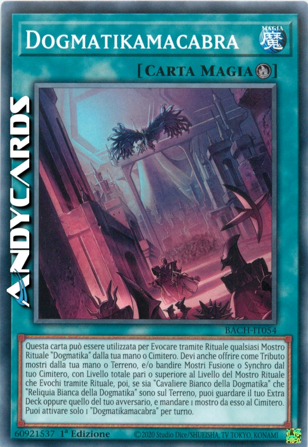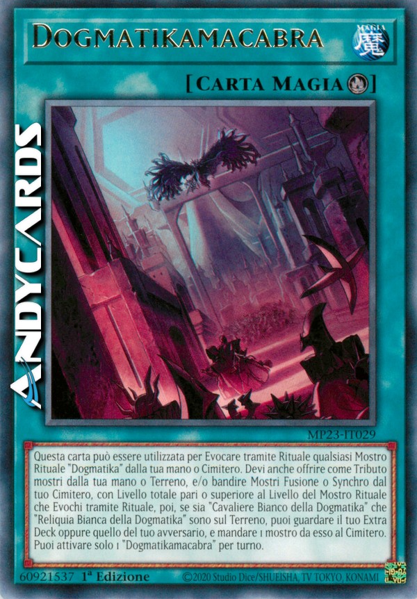 Questa carta può essere utilizzata per Evocare tramite Rituale qualsiasi Mostro Rituale "Dogmatika" dalla tua mano o Cimitero. Devi anche offrire come Tributo mostri dalla tua mano o Terreno, e/o bandire Mostri Fusione o Synchro dal tuo Cimitero, con Livello totale pari o superiore al Livello del Mostro Rituale che Evochi tramite Rituale, poi, se sia "Cavaliere Bianco della Dogmatika" che "Reliquia Bianca della Dogmatika" sono sul Terreno, puoi guardare il tuo Extra Deck oppure quello del tuo avversario, e mandare 1 mostro da esso al Cimitero. Puoi attivare solo 1 "Dogmatikamacabra" per turno.