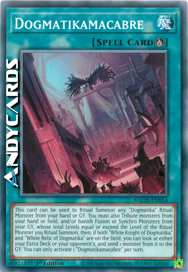 This card can be used to Ritual Summon any "Dogmatika" Ritual Monster from your hand or GY. You must also Tribute monsters from your hand or field, and/or banish Fusion or Synchro Monsters from your GY, whose total Levels equal or exceed the Level of the Ritual Monster you Ritual Summon, then, if both "White Knight of Dogmatika" and "White Relic of Dogmatika" are on the field, you can look at either your Extra Deck or your opponent's, and send 1 monster from it to the GY. You can only activate 1 "Dogmatikamacabre" per turn.