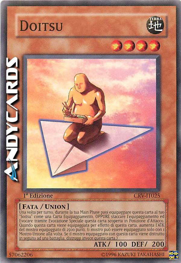 Una volta per turno, durante la tua Main Phase, puoi equipaggiare questa carta al tuo "Soitsu" come una Carta Equipaggiamento. OPPURE staccare l'equipaggiamento ed Evocare Tramite Evocazione Speciale questa carta scoperta in Posizione di Attacco. Quando questa carta viene equipaggiata per effetto di questa carta, aumenta l'ATK del mostro equipaggiato di 2500 punti. (1 mostro può essere Equipaggiato con 1 solo Mostro Unione alla volta. Se il mostro equipaggiato con questa carta viene distrutto in seguito ad una battaglia, distruggi invece questa carta)