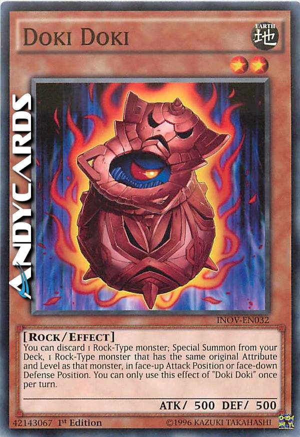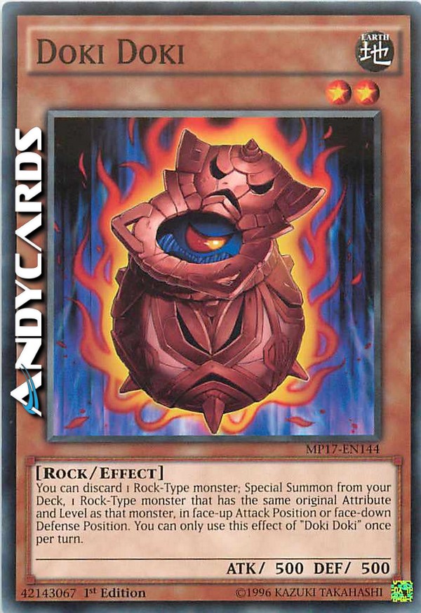 You can discard 1 Rock-Type monster; Special Summon from your Deck, 1 Rock-Type monster that has the same original Attribute and Level as that monster, in face-up Attack Position or face-down Defense Position. You can only use this effect of "Doki Doki" once per turn.