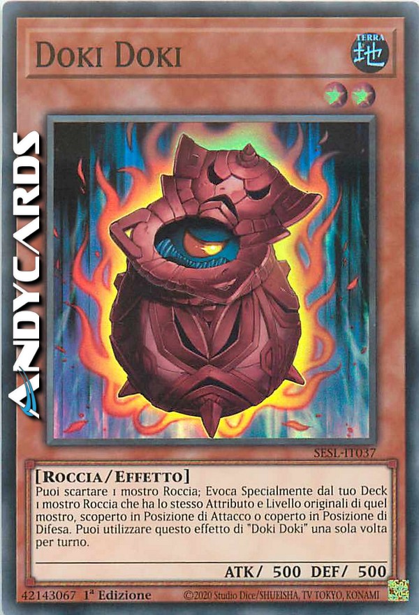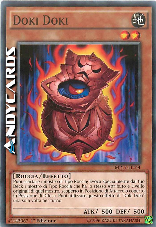 Puoi scartare 1 mostro di Tipo Roccia; Evoca Specialmente dal tuo Deck 1 mostro di Tipo Roccia che ha lo stesso Attributo e Livello originali di quel mostro, scoperto in Posizione di Attacco o coperto in Posizione di Difesa. Puoi utilizzare questo effetto di "Doki Doki" una sola volta per turno.