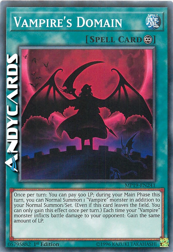Una volta per turno: puoi pagare 500 LP; durante la tua Main Phase in questo turno, puoi Evocare Normalmente 1 mostro "Vampiro" in aggiunta alla tua Evocazione Normale/Posizionamento. (Anche se questa carta lascia il Terreno. Puoi guadagnare questo effetto una sola volta per turno.) Ogni volta che un tuo mostro "Vampiro" infligge danno da combattimento al tuo avversario: guadagni lo stesso ammontare di LP.