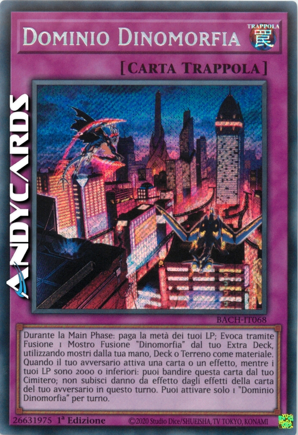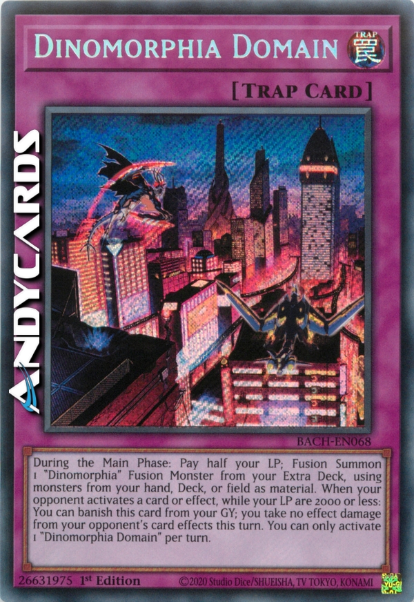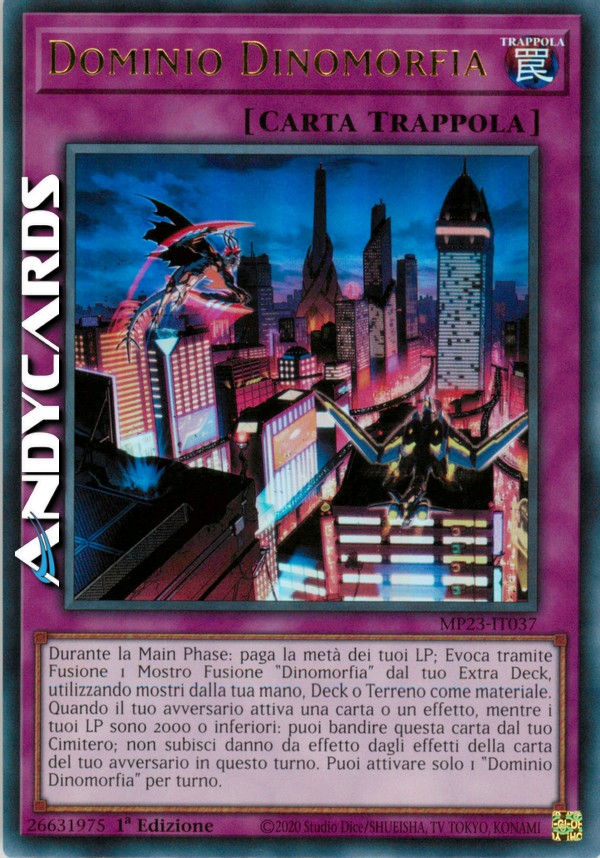 Durante la Main Phase: paga la metà dei tuoi LP; Evoca tramite Fusione 1 Mostro Fusione "Dinomorfia" dal tuo Extra Deck, utilizzando mostri dalla tua mano, Deck o Terreno come materiale. Quando il tuo avversario attiva una carta o un effetto, mentre i tuoi LP sono 2000 o inferiori: puoi bandire questa carta dal tuo Cimitero; non subisci danno da effetto dagli effetti della carta del tuo avversario in questo turno. Puoi attivare solo 1 "Dominio Dinomorfia" per turno.