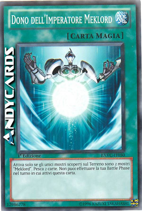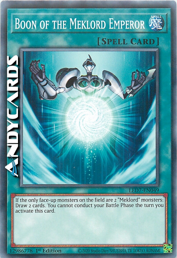 Se gli unici mostri scoperti sul Terreno sono 2 mostri "Meklord": pesca 2 carte. Non puoi effettuare la tua Battle Phase nel turno in cui attivi questa carta.