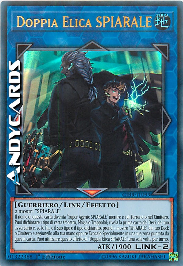 2 mostri "SPIARALE" - Il nome di questa carta diventa "Super Agente SPIARALE" mentre è sul Terreno o nel Cimitero. Puoi dichiarare 1 tipo di carta (Mostro, Magia o Trappola); rivela la prima carta del Deck del tuo avversario e, se lo fai, e il suo tipo è il tipo dichiarato, prendi 1 mostro "SPIARALE" dal tuo Deck o Cimitero e aggiungilo alla tua mano oppure Evocalo Specialmente in una tua zona puntata da questa carta. Puoi utilizzare questo effetto di "Doppia Elica SPIARALE" una sola volta per turno.