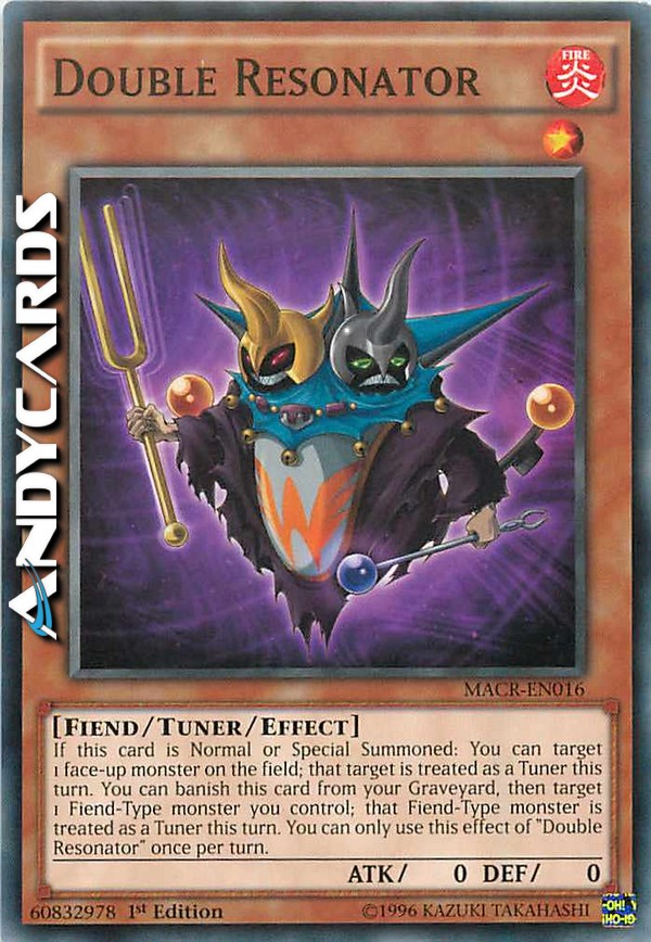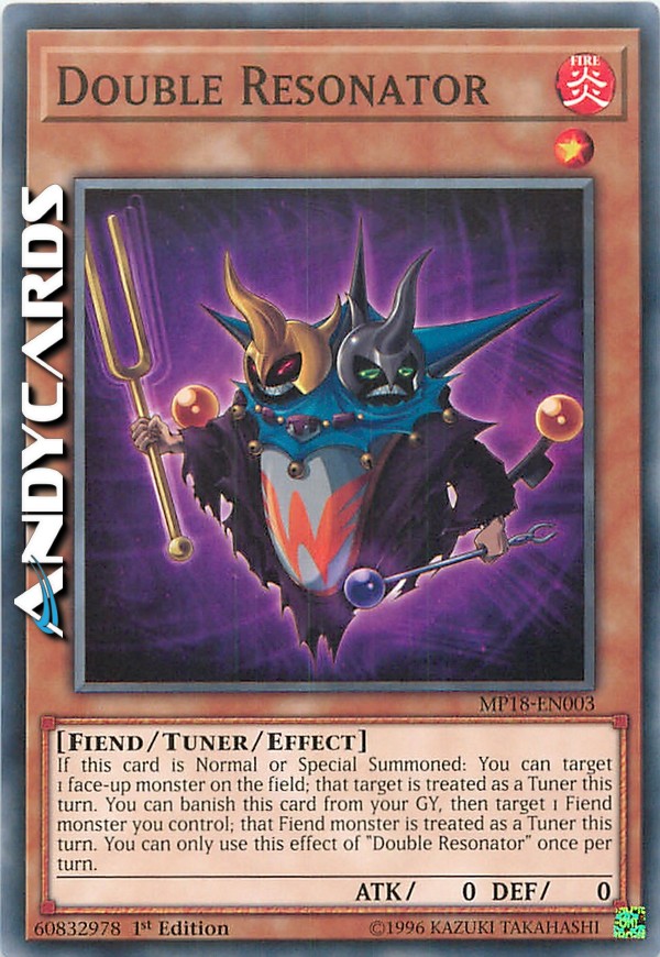 If this card is Normal or Special Summoned: You can target 1 face-up monster on the field; that target is treated as a Tuner this turn. You can banish this card from your Graveyard, then target 1 Fiend-Type monster you control; that Fiend-Type monster is treated as a Tuner this turn. You can only use this effect of "Double Resonator" once per turn.