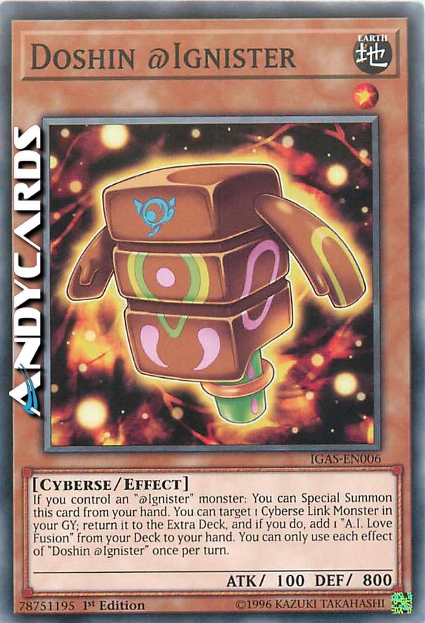 Se controlli un mostro "@Ignister": puoi Evocare Specialmente questa carta dalla tua mano. Puoi scegliere come bersaglio 1 Mostro Link Cyberso nel tuo Cimitero; fallo ritornare nell'Extra Deck e, se lo fai, aggiungi 1 "Fusione Amore A.I." dal tuo Deck alla tua mano. Puoi utilizzare ogni effetto di "Doshin @Ignister" una sola volta per turno.