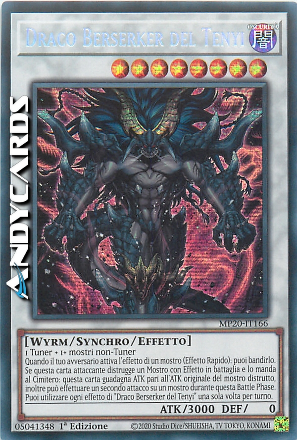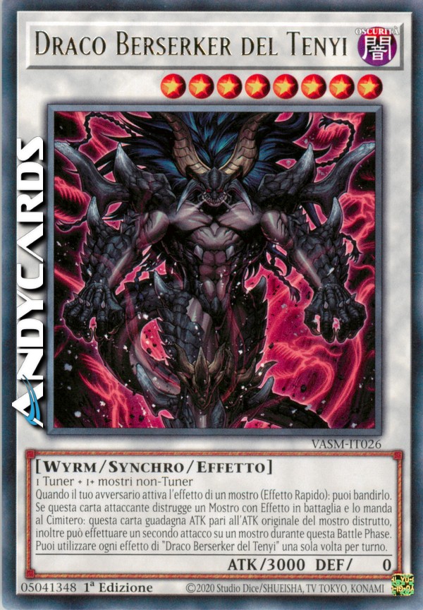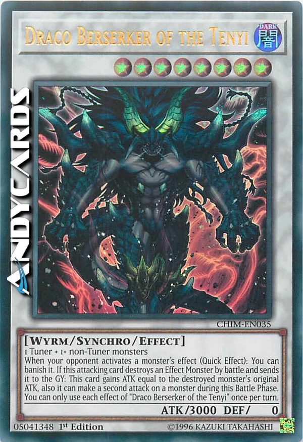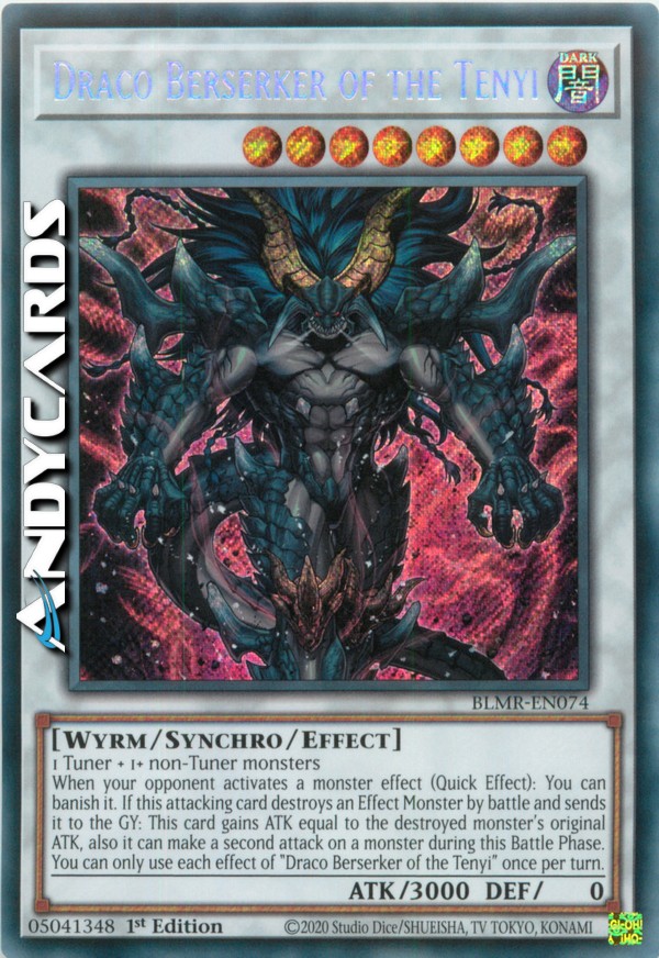 Quando il tuo avversario attiva l'effetto di un mostro (Effetto Rapido): puoi bandirlo. Se questa carta attaccante distrugge un Mostro con Effetto in battaglia e lo manda al Cimitero: questa carta guadagna ATK pari all'ATK originale del mostro distrutto, inoltre può effettuare un secondo attacco su un mostro durante questa Battle Phase. Puoi utilizzare ogni effetto di "Draco Berserker del Tenyi" una sola volta per turno.