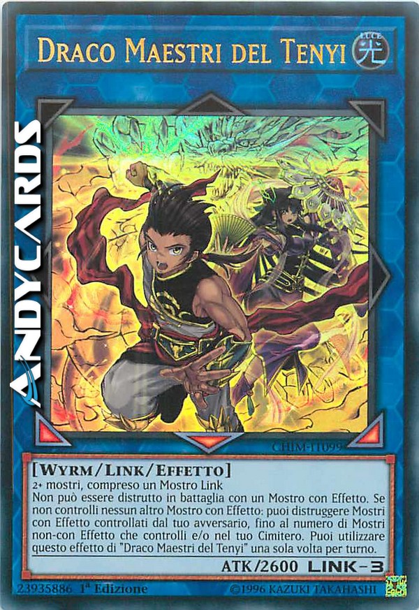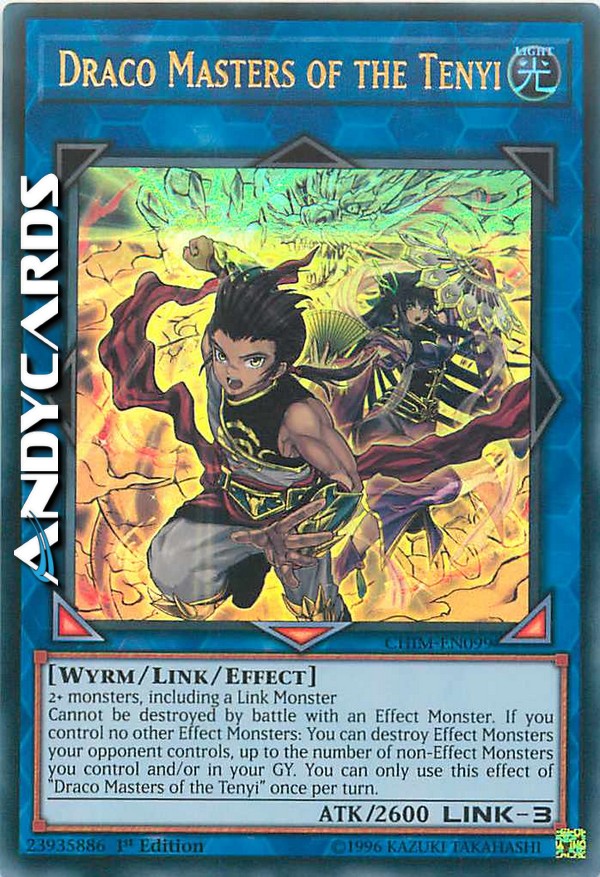 Non può essere distrutto in battaglia con un Mostro con Effetto. Se non controlli nessun altro Mostro con Effetto: puoi distruggere Mostri con Effetto controllati dal tuo avversario, fino al numero di Mostri non-con Effetto che controlli e/o nel tuo Cimitero. Puoi utilizzare questo effetto di "Draco Maestri del Tenyi" una sola volta per turno.