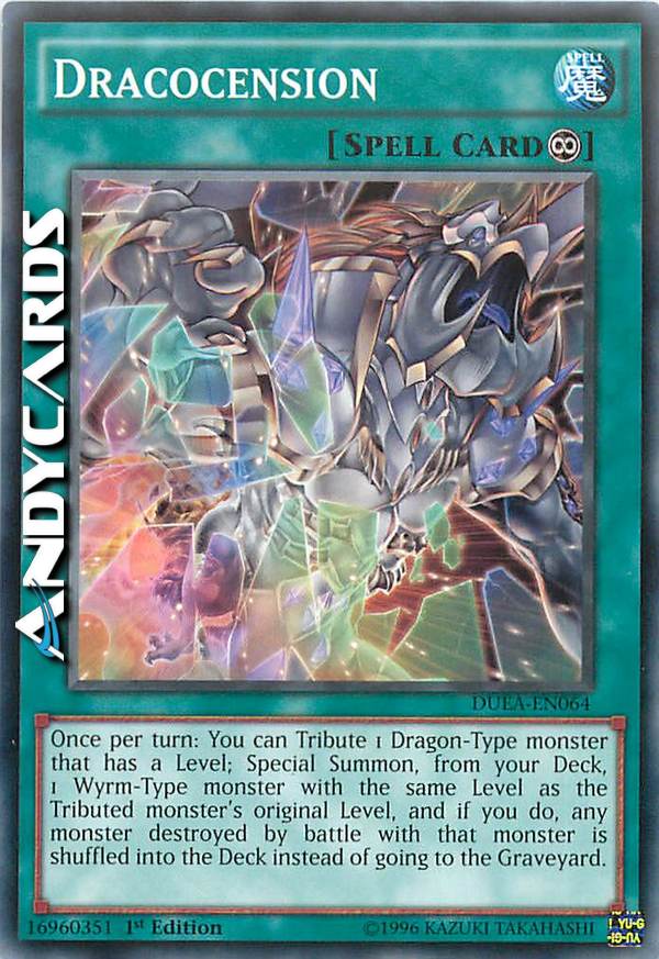 Once per turn: You can Tribute 1 Dragon-Type monster that has a Level; Special Summon, from your Deck, 1 Wyrm-Type monster with the same Level as the Tributed monster's original Level, and if you do, any monster destroyed by battle with that monster is shuffled into the Deck instead of going to the Graveyard.