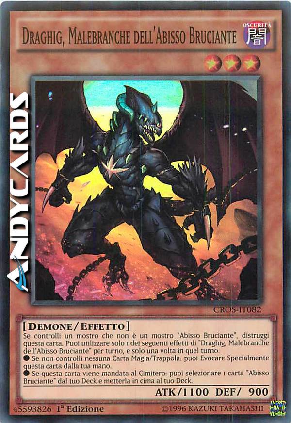 Se controlli un mostro che non è un mostro "Abisso Bruciante", distruggi questa carta. Puoi utilizzare solo 1 di questi effetti di "Draghig, Malebranche dell'Abisso Bruciante" per turno, e solo una volta in quel turno. - Se non controlli nessuna Carta Magia/Trappola: puoi Evocare Specialmente questa carta dalla tua mano. - Se questa carta viene mandata al Cimitero: puoi selezionare 1 carta "Abisso Bruciante" dal tuo Deck e metterla in cima al tuo Deck.