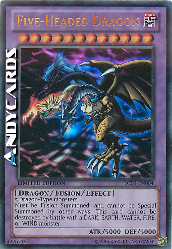5 Dragon-Type monsters This monster cannot be Special Summoned except by Fusion Summon. This card cannot be destroyed by battle with an EARTH, WATER, FIRE, WIND, or DARK monster. (Damage calculation is applied normally. )