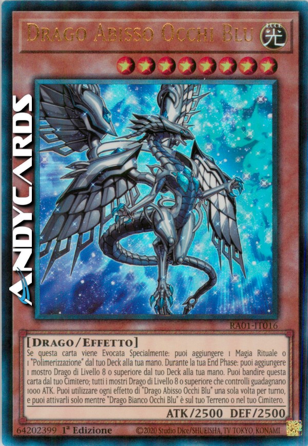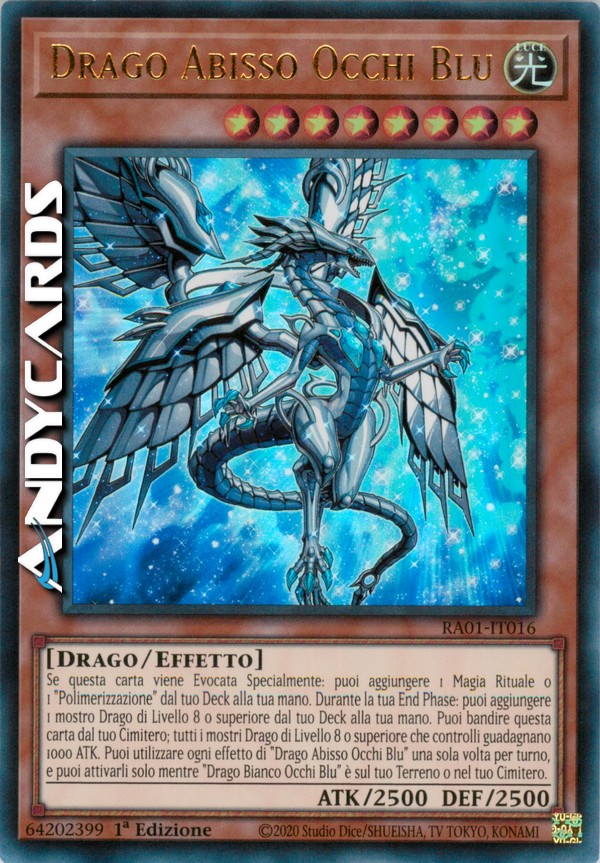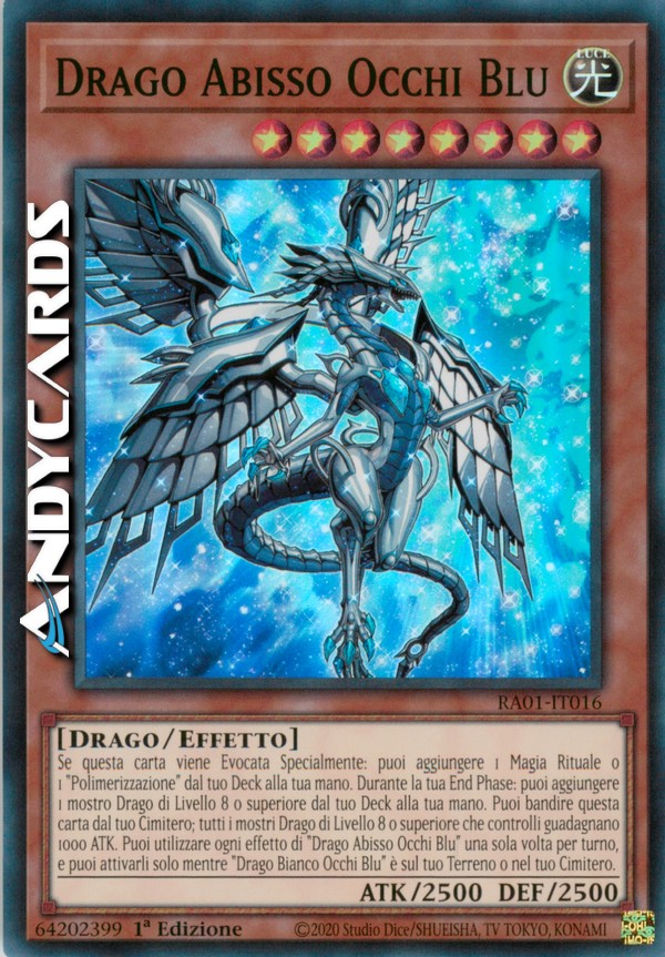 Se questa carta viene Evocata Specialmente: puoi aggiungere 1 Magia Rituale o 1 "Polimerizzazione" dal tuo Deck alla tua mano. Durante la tua End Phase: puoi aggiungere 1 mostro Drago di Livello 8 o superiore dal tuo Deck alla tua mano. Puoi bandire questa carta dal tuo Cimitero; tutti i mostri Drago di Livello 8 o superiore che controlli guadagnano 1000 ATK. Puoi utilizzare ogni effetto di "Drago Abisso Occhi Blu" una sola volta per turno, e puoi attivarli solo mentre "Drago Bianco Occhi Blu" è sul tuo Terreno o nel tuo Cimitero.