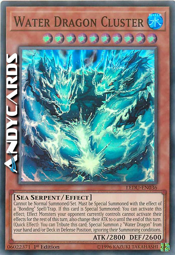 Cannot be Normal Summoned/Set. Must be Special Summoned with the effect of a "Bonding" Spell/Trap. If this card is Special Summoned: You can activate this effect; Effect Monsters your opponent currently controls cannot activate their effects for the rest of this turn, also change their ATK to 0 until the end of this turn. (Quick Effect): You can Tribute this card; Special Summon 2 "Water Dragon" from your hand and/or Deck in Defense Position, ignoring their Summoning conditions.
