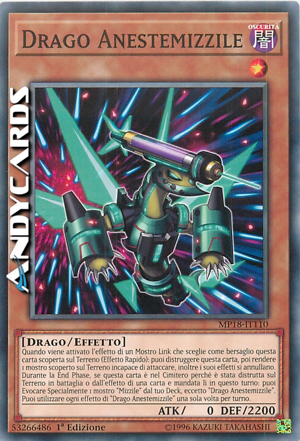 Quando viene attivato l'effetto di un Mostro Link che sceglie come bersaglio questa carta scoperta sul Terreno (Effetto Rapido): puoi distruggere questa carta, poi rendere 1 mostro scoperto sul Terreno incapace di attaccare, inoltre i suoi effetti si annullano. Durante la End Phase, se questa carta è nel Cimitero perché è stata distrutta sul Terreno in battaglia o dall'effetto di una carta e mandata lì in questo turno: puoi Evocare Specialmente 1 mostro "Mizzile" dal tuo Deck, eccetto "Drago Anestemizzile". Puoi utilizzare ogni effetto di "Drago Anestemizzile" una sola volta per turno.