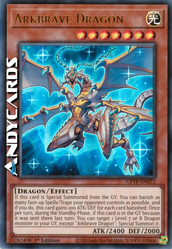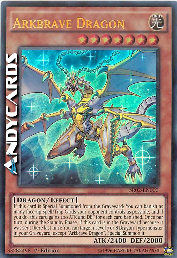 If this card is Special Summoned from the Graveyard: You can banish as many face-up Spell/Trap Cards your opponent controls as possible, and if you do, this card gains 200 ATK and DEF for each card banished. Once per turn, during the Standby Phase, if this card is in the Graveyard because it was sent there last turn: You can target 1 Level 7 or 8 Dragon-Type monster in your Graveyard, except "Arkbrave Dragon"; Special Summon it.