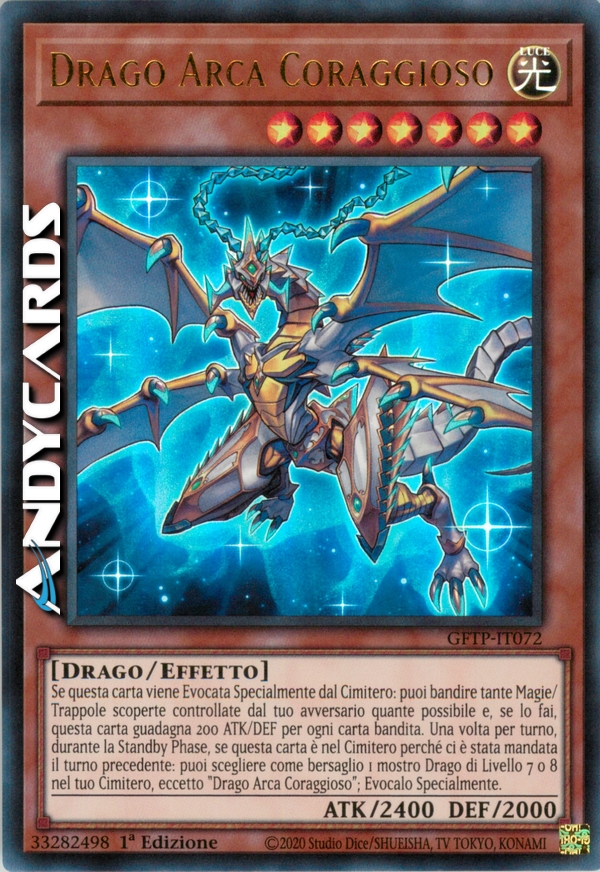 Se questa carta viene Evocata Specialmente dal Cimitero: puoi bandire tante Carte Magia/Trappola scoperte controllate dal tuo avversario quante possibile e, se lo fai, questa carta guadagna 200 ATK e DEF per ogni carta bandita. Una volta per turno, durante la Standby Phase, se questa carta è nel Cimitero perchè ci è stata mandata il turno precedente: puoi scegliere come bersaglio 1 mostro di Tipo Drago di Livello 7 o 8 nel tuo Cimitero, eccetto "Drago Arca Coraggioso"; Evocalo Specialmente.