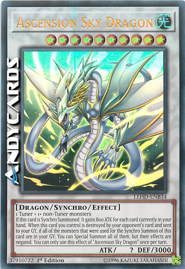 If this card is Synchro Summoned: It gains 800 ATK for each card currently in your hand. When this card you control is destroyed by your opponent's card and sent to your GY, if all of the monsters that were used for the Synchro Summon of this card are in your GY: You can Special Summon all of them, but their effects are negated. You can only use this effect of "Ascension Sky Dragon" once per turn.