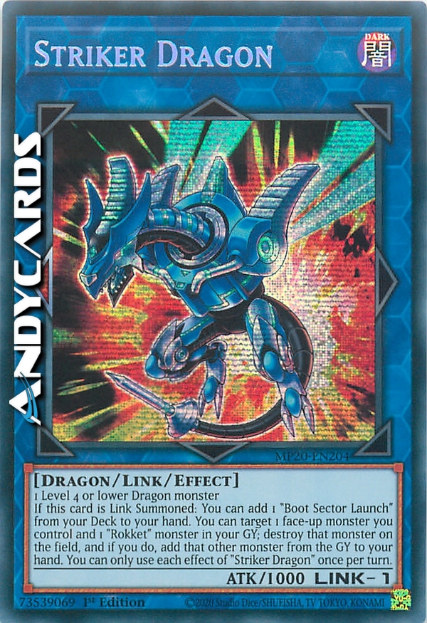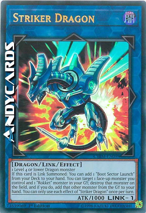 If this card is Link Summoned: You can add 1 "Boot Sector Launch" from your Deck to your hand. You can target 1 face-up monster you control and 1 "Rokket" monster in your GY; destroy that monster on the field, and if you do, add that other monster from the GY to your hand. You can only use each effect of "Striker Dragon" once per turn.