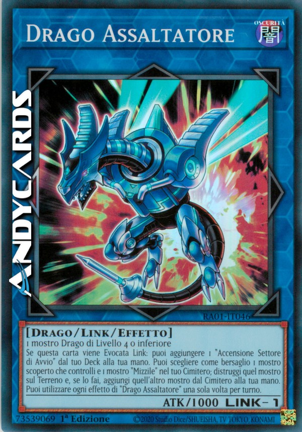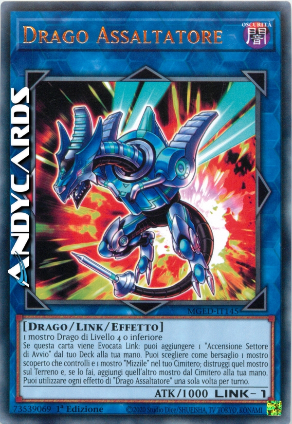 Se questa carta viene Evocata Link: puoi aggiungere 1 "Accensione Settore di Avvio" dal tuo Deck alla tua mano. Puoi scegliere come bersaglio 1 mostro scoperto che controlli and 1 mostro "Mizzile" nel tuo Cimitero; distruggi quel mostro sul Terreno e, se lo fai, aggiungi quell'altro mostro dal Cimitero alla tua mano. Puoi utilizzare ogni effetto di "Drago Assaltatore" una sola volta per turno.