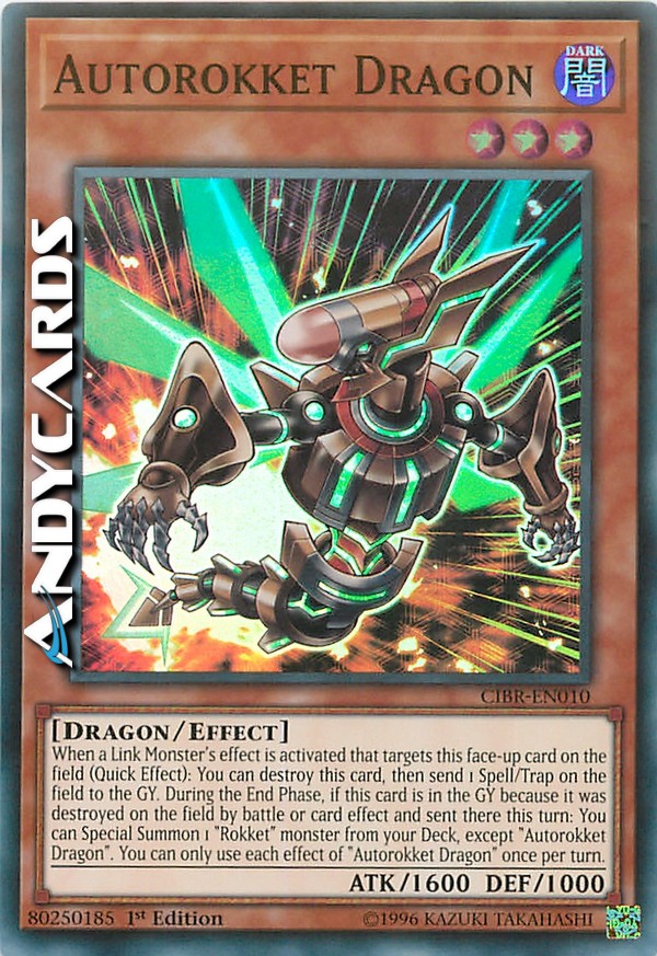 When a Link Monster's effect is activated that targets this face-up card on the field (Quick Effect): You can destroy this card, then send 1 Spell/Trap on the field to the GY. During the End Phase, if this card is in the GY because it was destroyed on the field by battle or card effect and sent there this turn: You can Special Summon 1 "Rokket" monster from your Deck, except "Autorokket Dragon". You can only use each effect of "Autorokket Dragon" once per turn.