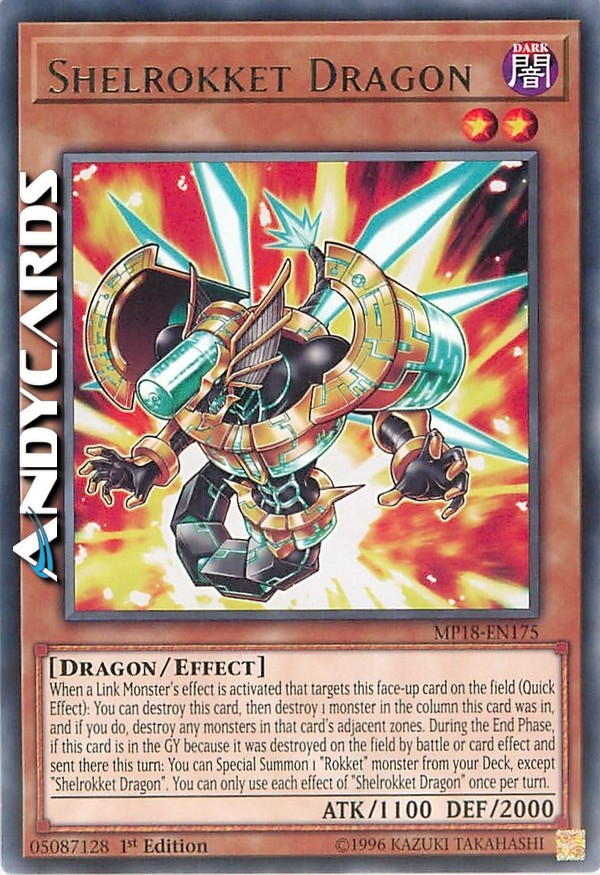 When a Link Monster's effect is activated that targets this face-up card on the field (Quick Effect): You can destroy this card, then destroy 1 monster in the column this card was in, and if you do, destroy any monsters in that card's adjacent zones. During the End Phase, if this card is in the GY because it was destroyed on the field by battle or card effect and sent there this turn: You can Special Summon 1 "Rokket" monster from your Deck, except "Shelrokket Dragon". You can only use each effect of "Shelrokket Dragon" once per turn.