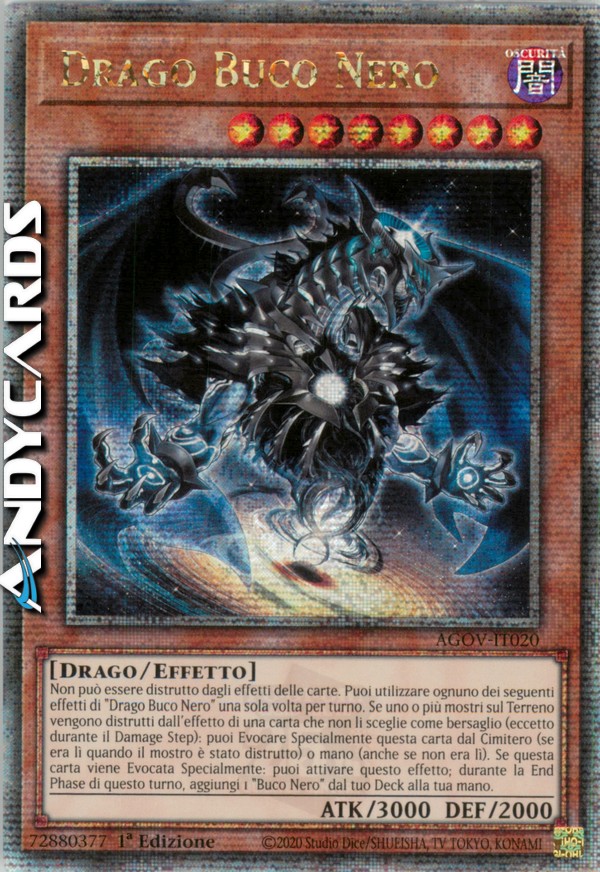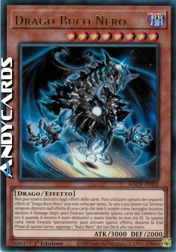Non può essere distrutto dagli effetti delle carte. Puoi utilizzare ognuno dei seguenti effetti di "Drago Buco Nero" una sola volta per turno. Se uno o più mostri sul Terreno vengono distrutti dall'effetto di una carta che non li sceglie come bersaglio (eccetto durante il Damage Step): puoi Evocare Specialmente questa carta dal Cimitero (se era lì quando il mostro è stato distrutto) o mano (anche se non era lì). Se questa carta viene Evocata Specialmente: puoi attivare questo effetto; durante la End Phase di questo turno, aggiungi 1 "Buco Nero" dal tuo Deck alla tua mano.