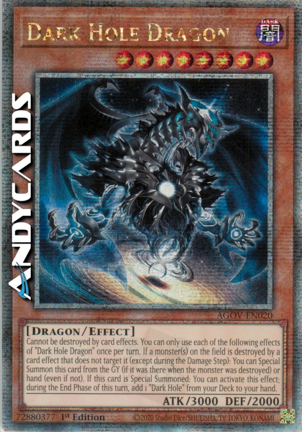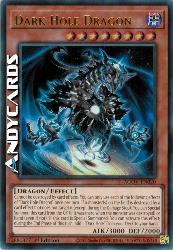 Cannot be destroyed by card effects. You can only use each of the following effects of "Dark Hole Dragon" once per turn. If a monster(s) on the field is destroyed by a card effect that does not target it (except during the Damage Step): You can Special Summon this card from the GY (if it was there when the monster was destroyed) or hand (even if not). If this card is Special Summoned: You can activate this effect; during the End Phase of this turn, add 1 "Dark Hole" from your Deck to your hand.