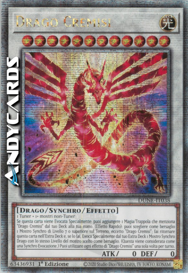 Se questa carta viene Evocata Specialmente: puoi aggiungere 1 Magia/Trappola che menziona "Drago Cremisi" dal tuo Deck alla tua mano. (Effetto Rapido): puoi scegliere come bersaglio 1 Mostro Synchro di Livello 7 o superiore sul Terreno, eccetto "Drago Cremisi"; fai ritornare questa carta nell'Extra Deck e, se lo fai, Evoca Specialmente dal tuo Extra Deck 1 Mostro Synchro Drago con lo stesso Livello del mostro scelto come bersaglio. (Questa viene considerata come una Synchro Evocazione.) Puoi utilizzare ogni effetto di "Drago Cremisi" una sola volta per turno.