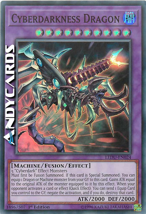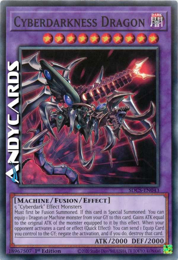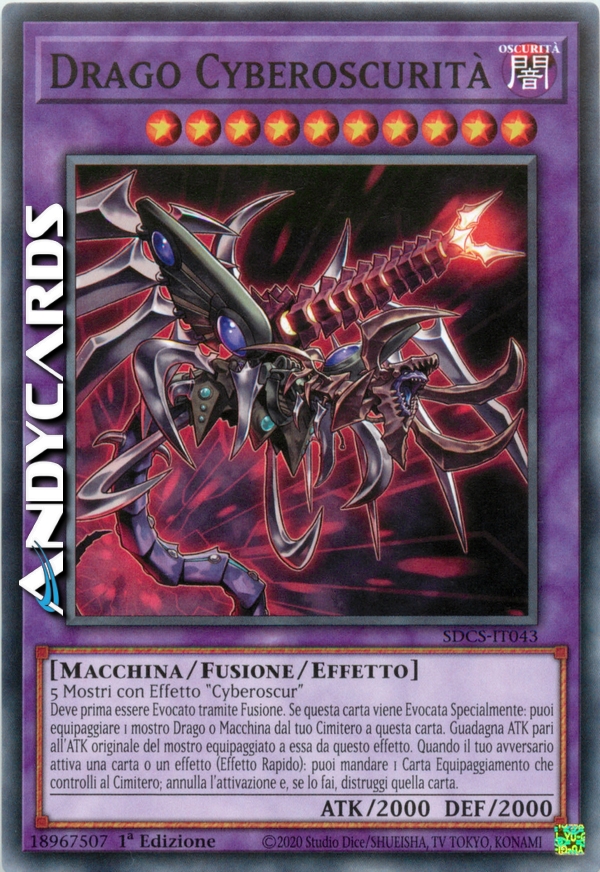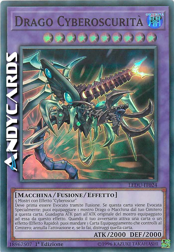 5 Mostri con Effetto "Cyberoscur" - Deve prima essere Evocato tramite Fusione. Se questa carta viene Evocata Specialmente: puoi equipaggiare 1 mostro Drago o Macchina dal tuo Cimitero a questa carta. Guadagna ATK pari all'ATK originale del mostro equipaggiato ad essa da questo effetto. Quando il tuo avversario attiva una carta o un effetto (Effetto Rapido): puoi mandare 1 Carta Equipaggiamento che controlli al Cimitero; annulla l'attivazione e, se lo fai, distruggi quella carta.