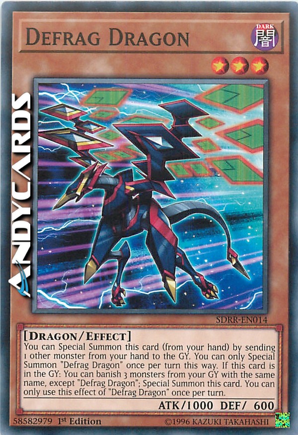 You can Special Summon this card (from your hand) by sending 1 other monster from your hand to the GY. You can only Special Summon "Defrag Dragon" once per turn this way. If this card is in the GY: You can banish 3 monsters from your GY with the same name, except "Defrag Dragon"; Special Summon this card. You can only use this effect of "Defrag Dragon" once per turn.