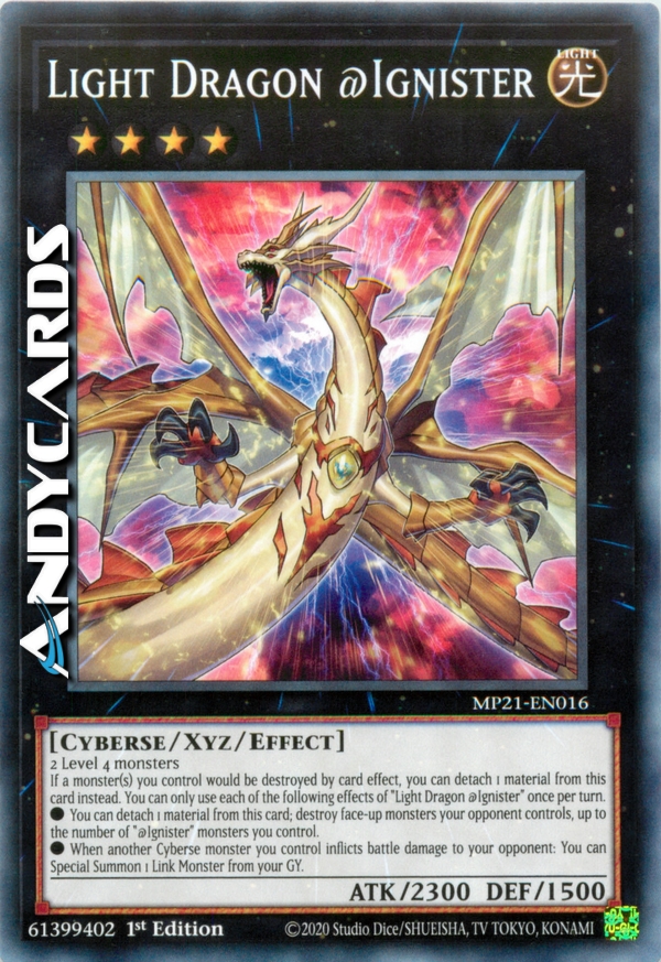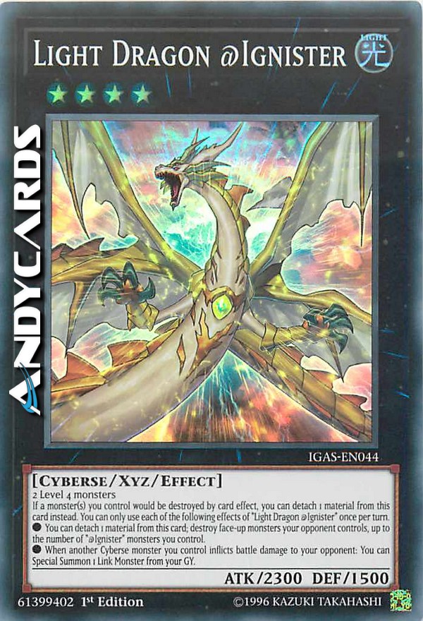 If a monster(s) you control would be destroyed by card effect, you can detach 1 material from this card instead. You can only use each of the following effects of "Light Dragon @Ignister" once per turn.