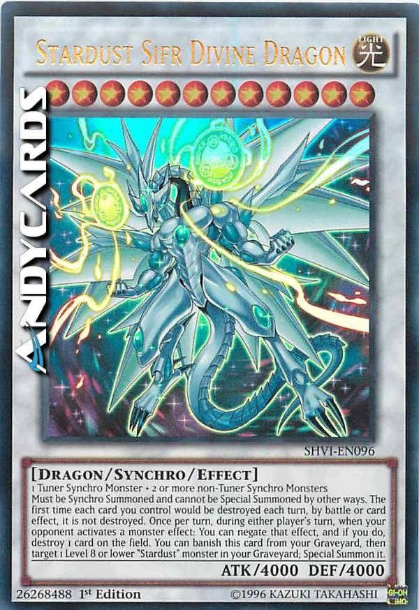 1 Mostro Synchro Tuner + 2 o più Mostri Synchro non-Tuner - Deve esser Synchro Evocato e non può essere Evocato Specialmente in altri modi. La prima volta che ogni carta che controlli sta per essere distrutta in ogni turno, in battaglia o dall'effetto di una carta, invece non viene distrutta. Una volta per turno, durante il turno di qualsiasi giocatore, quando il tuo avversario attiva l'effetto di un mostro: puoi annullare quell'effetto e, se lo fai, distruggi 1 carta sul Terreno. Puoi bandire questa carta dal tuo Cimitero, poi scegliere come bersaglio 1 mostro "Polvere di Stelle" di Livello 8 o inferiore nel tuo Cimitero; Evocalo Specialmente.