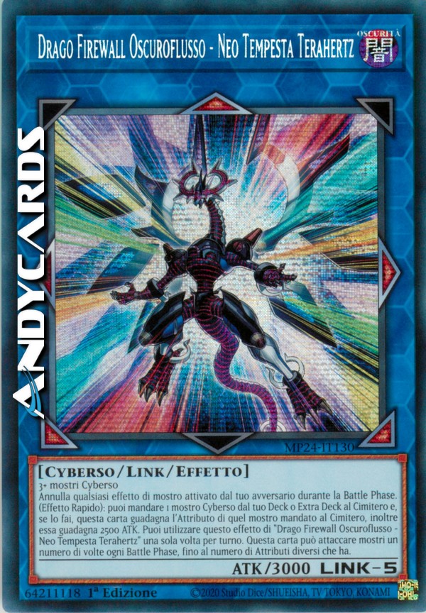 Annulla qualsiasi effetto di mostro attivato dal tuo avversario durante la Battle Phase. (Effetto Rapido): puoi mandare 1 mostro Cyberso dal tuo Deck o Extra Deck al Cimitero e, se lo fai, questa carta guadagna l'Attributo di quel mostro mandato al Cimitero, inoltre essa guadagna 2500 ATK. Puoi utilizzare questo effetto di "Drago Firewall Oscuroflusso - Neo Tempesta Terahertz" una sola volta per turno. Questa carta può attaccare mostri un numero di volte ogni Battle Phase, fino al numero di Attributi diversi che ha.