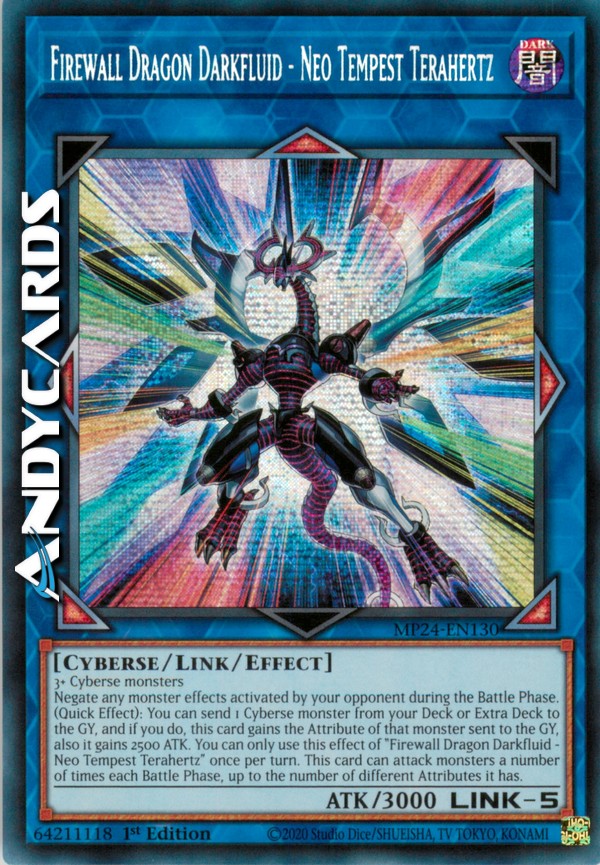 Negate any monster effects activated by your opponent during the Battle Phase. (Quick Effect): You can send 1 Cyberse monster from your Deck or Extra Deck to the GY, and if you do, this card gains the Attribute of that monster sent to the GY, also it gains 2500 ATK. You can only use this effect of "Firewall Dragon Darkfluid - Neo Tempest Terahertz" once per turn. This card can attack monsters a number of times each Battle Phase, up to the number of different Attributes it has.