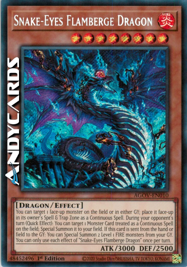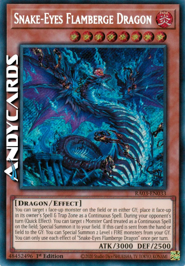 You can target 1 face-up monster on the field or in either GY; place it face-up in its owner's Spell & Trap Zone as a Continuous Spell. During your opponent's turn (Quick Effect): You can target 1 Monster Card treated as a Continuous Spell on the field; Special Summon it to your field. If this card is sent from the hand or field to the GY: You can Special Summon 2 Level 1 FIRE monsters from your GY. You can only use each effect of "Snake-Eyes Flamberge Dragon" once per turn.