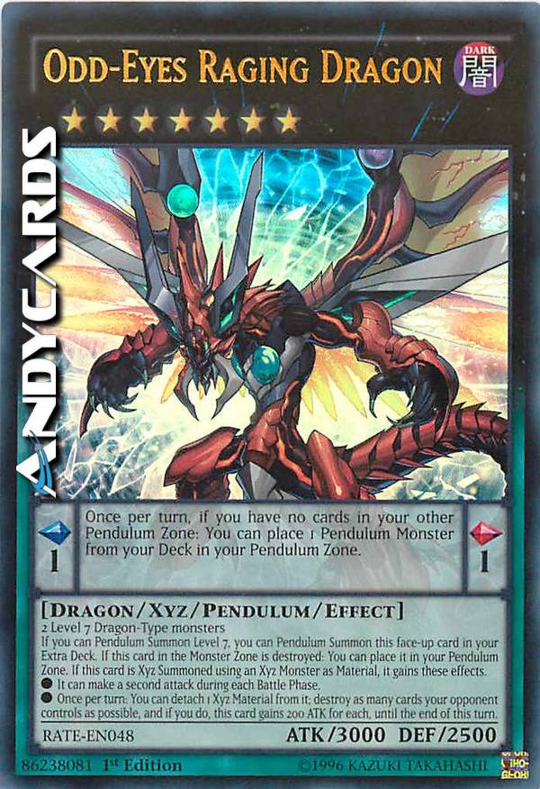 Valore Pendulum 1 Una volta per turno, se non hai carte nella tua altra Zona Pendulum: puoi mettere 1 Mostro Pendulum dal tuo Deck nella tua Zona Pendulum. - 2 mostri di Tipo Drago di Livello 7 - Se puoi Evocare Pendulum di Livello 7, puoi Evocare Pendulum questa carta scoperta nel tuo Extra Deck. Se questa carta nella Zona Mostri viene distrutta: puoi metterla nella tua Zona Pendulum. Se questa carta viene Evocata Xyz utilizzando un Mostro Xyz come Materiale, essa guadagna questi effetti. - Essa può effettuare un secondo attacco durante ogni Battle Phase. - Una volta per turno: puoi staccare 1 Materiale Xyz da essa; distruggi tante carte controllate dal tuo avversario quante possibile e, se lo fai, questa carta guadagna 200 ATK per ognuna, fino alla fine di questo turno.