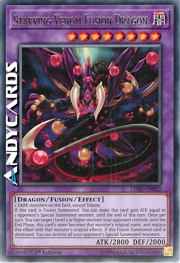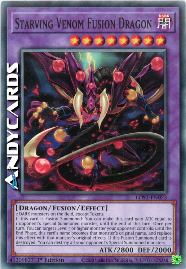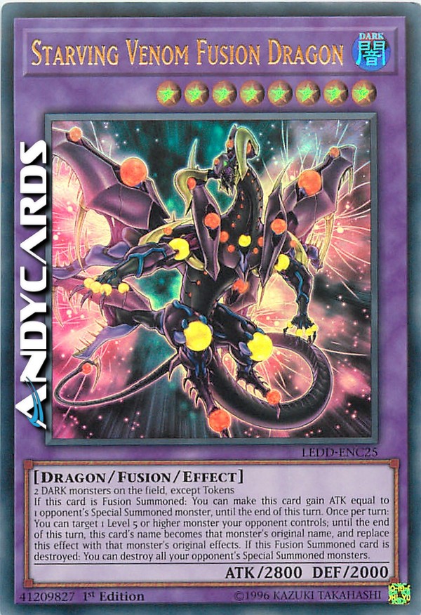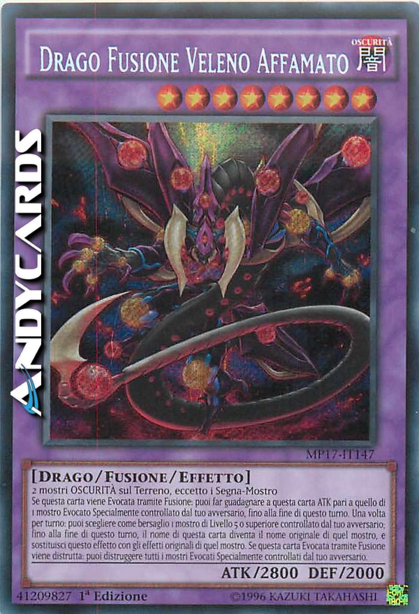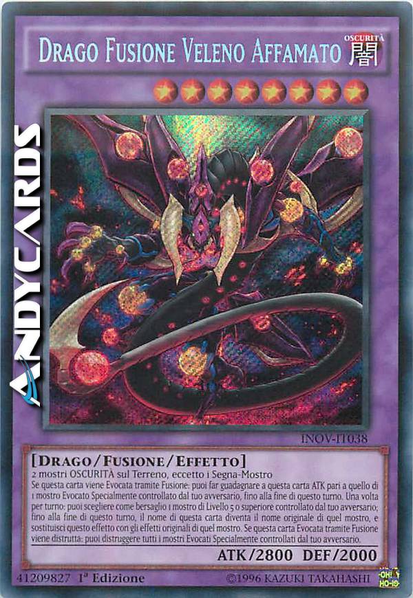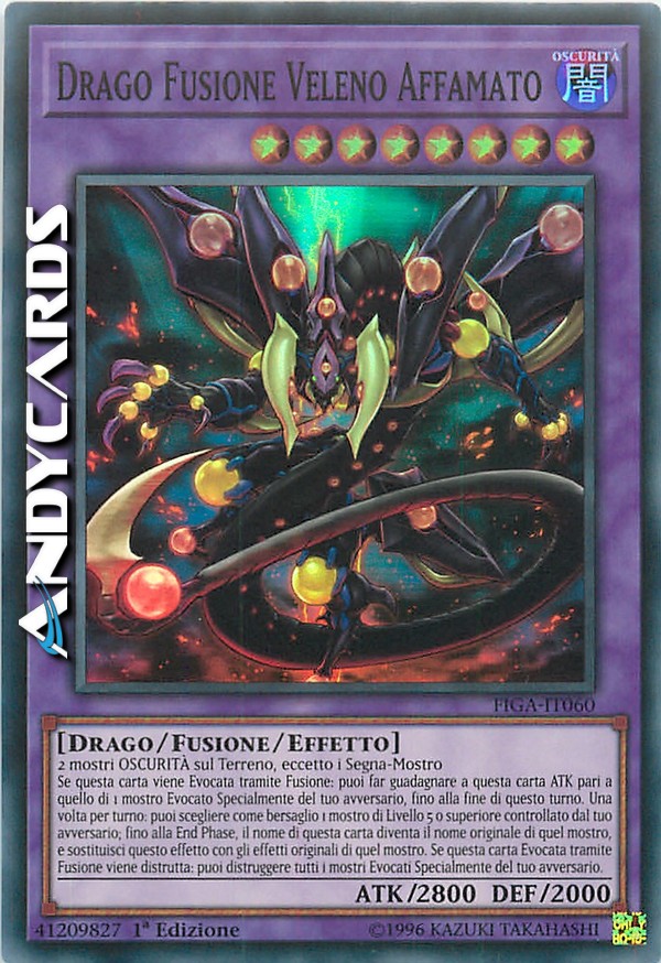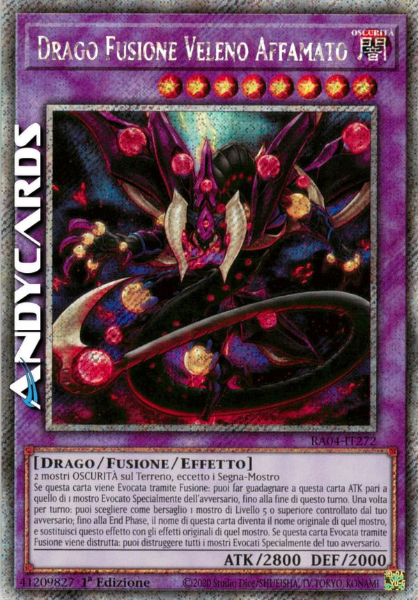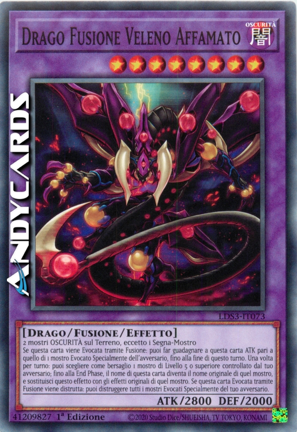 2 mostri OSCURITÀ sul Terreno, eccetto i Segna-Mostro - Se questa carta viene Evocata tramite Fusione: puoi far guadagnare a questa carta ATK pari a quello di 1 mostro Evocato Specialmente del tuo avversario, fino alla fine di questo turno. Una volta per turno: puoi scegliere come bersaglio 1 mostro di Livello 5 o superiore controllato dal tuo avversario; fino alla fine di questo turno, il nome di questa carta diventa il nome originale di quel mostro, e sostituisci questo effetto con gli effetti originali di quel mostro. Se questa carta Evocata tramite Fusione viene distrutta: puoi distruggere tutti i mostri Evocati Specialmente del tuo avversario.