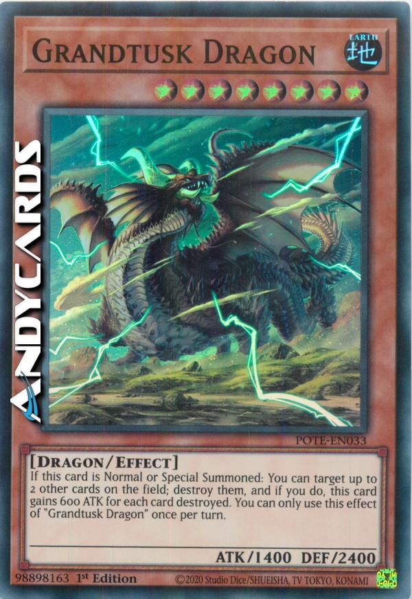 If this card is Normal or Special Summoned: You can target up to 2 other cards on the field; destroy them, and if you do, this card gains 600 ATK for each card destroyed. You can only use this effect of "Grandtusk Dragon" once per turn.