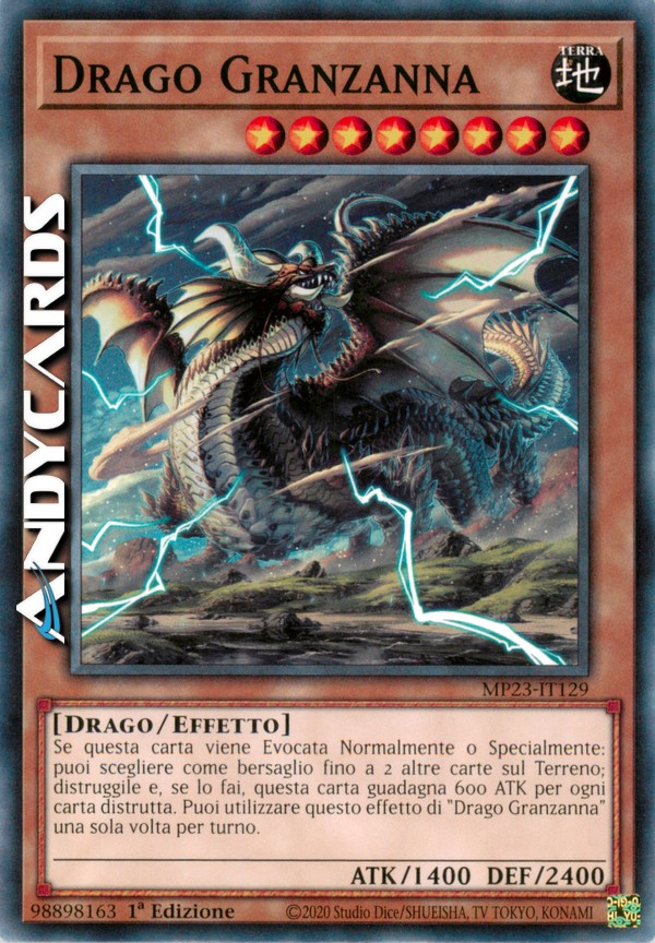 Se questa carta viene Evocata Normalmente o Specialmente: puoi scegliere come bersaglio fino a 2 altre carte sul Terreno; distruggile e, se lo fai, questa carta guadagna 600 ATK per ogni carta distrutta. Puoi utilizzare questo effetto di "Drago Granzanna" una sola volta per turno.