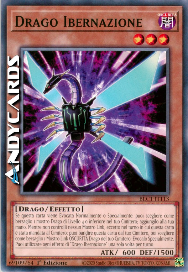 Se questa carta viene Evocata Normalmente o Specialmente: puoi scegliere come bersaglio 1 mostro Drago di Livello 4 o inferiore nel tuo Cimitero; aggiungilo alla tua mano. Mentre non controlli nessun Mostro Link, eccetto nel turno in cui questa carta è stata mandata al Cimitero: puoi bandire questa carta dal tuo Cimitero, poi scegliere come bersaglio 1 Mostro Link OSCURITÀ Drago nel tuo Cimitero; Evocalo Specialmente. Puoi utilizzare ogni effetto di "Drago Ibernazione" una sola volta per turno.