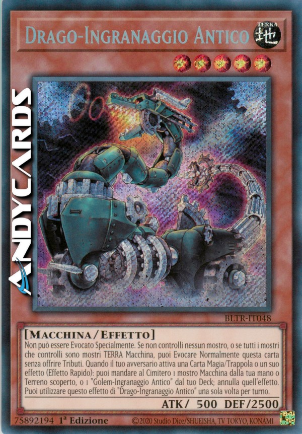 Non può essere Evocato Specialmente. Se non controlli nessun mostro, o se tutti i mostri che controlli sono mostri TERRA Macchina, puoi Evocare Normalmente questa carta senza offrire Tributi. Quando il tuo avversario attiva una Carta Magia/Trappola o un suo effetto (Effetto Rapido): puoi mandare al Cimitero 1 mostro Macchina dalla tua mano o Terreno scoperto, o 1 "Golem-Ingranaggio Antico" dal tuo Deck; annulla quell'effetto. Puoi utilizzare questo effetto di "Drago-Ingranaggio Antico" una sola volta per turno.