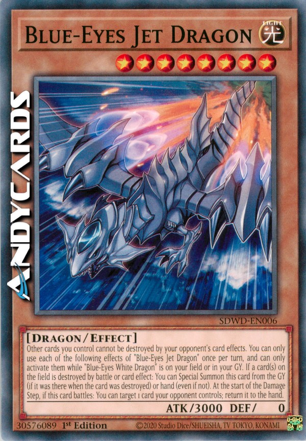 Other cards you control cannot be destroyed by your opponent's card effects. You can only use each of the following effects of "Blue-Eyes Jet Dragon" once per turn, and can only activate them while "Blue-Eyes White Dragon" is on your field or in your GY. If a card(s) on the field is destroyed by battle or card effect: You can Special Summon this card from the GY (if it was there when the card was destroyed) or hand (even if not). At the start of the Damage Step, if this card battles: You can target 1 card your opponent controls; return it to the hand.
