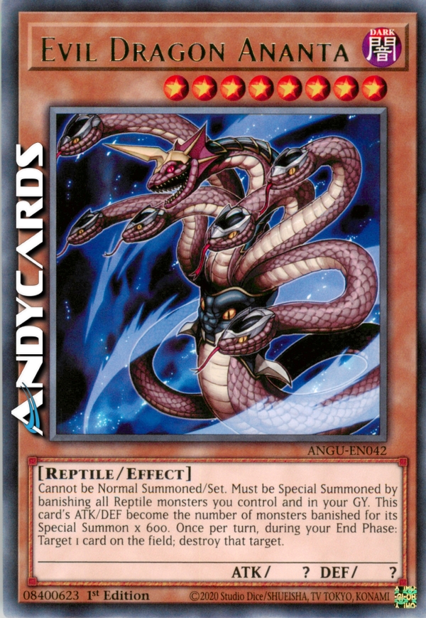 Questa carta non può essere Evocata tramite Evocazione Normale o Posizionata. Questa carta non può essere Evocata tramite Evocazione Speciale se non rimuovendo dal gioco tutti i mostri di Tipo Rettile dal tuo Terreno e Cimitero. L'ATK e il DEF di questa carta sono ognuno uguali al numero di mostri che hai rimosso x 600. Durante ogni tua End Phase, distruggi 1 carta sul Terreno.