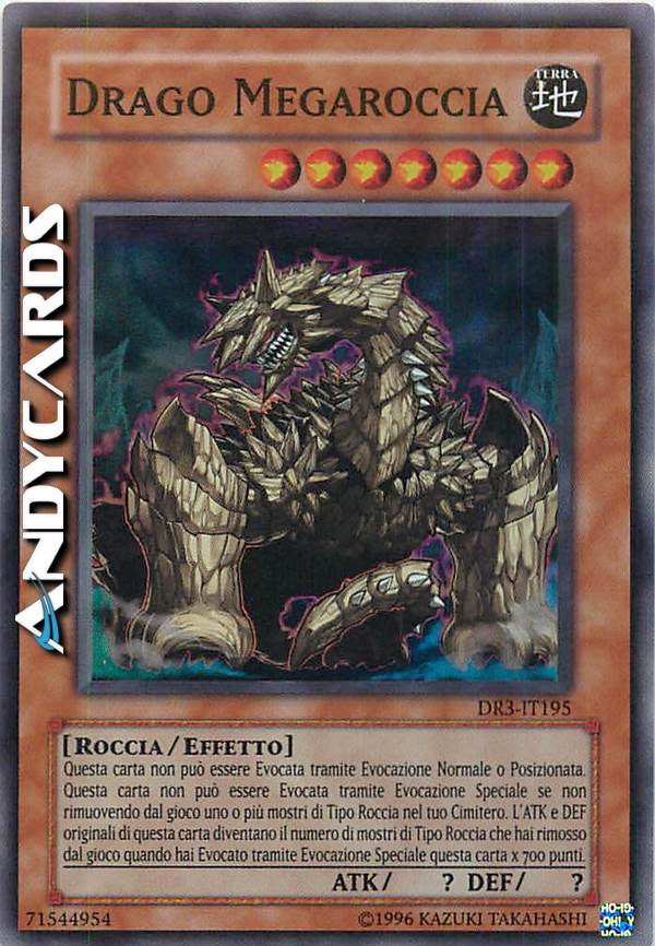 Questa carta non può essere Evocata tramite Evocazione Normale o Posizionata. Questa carta non può essere Evocata tramite Evocazione Speciale se non rimuovendo dal gioco uno o più mostri di Tipo Roccia nel tuo Cimitero. L'ATK e DEF originali di questa carta diventano il numero di mostri di Tipo Roccia che hai rimosso dal gioco quando hai evocato tramite Evocazione Speciale questa carta x 700 punti.