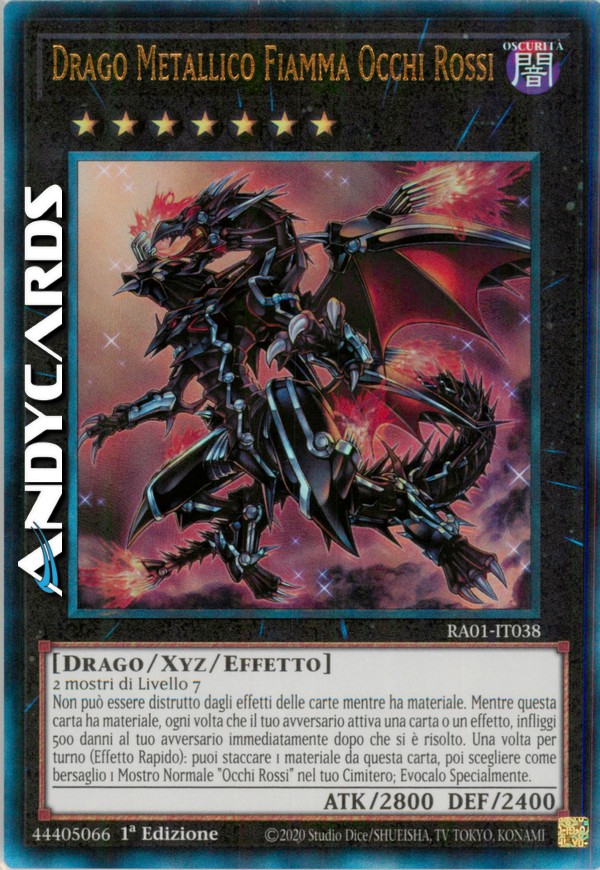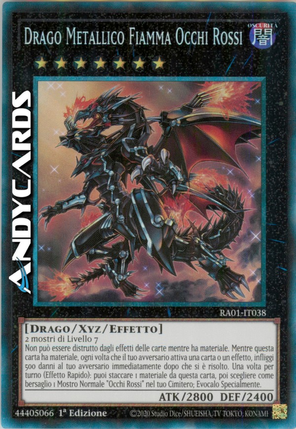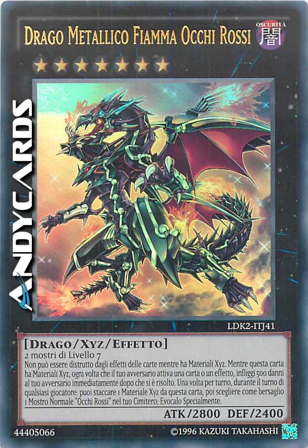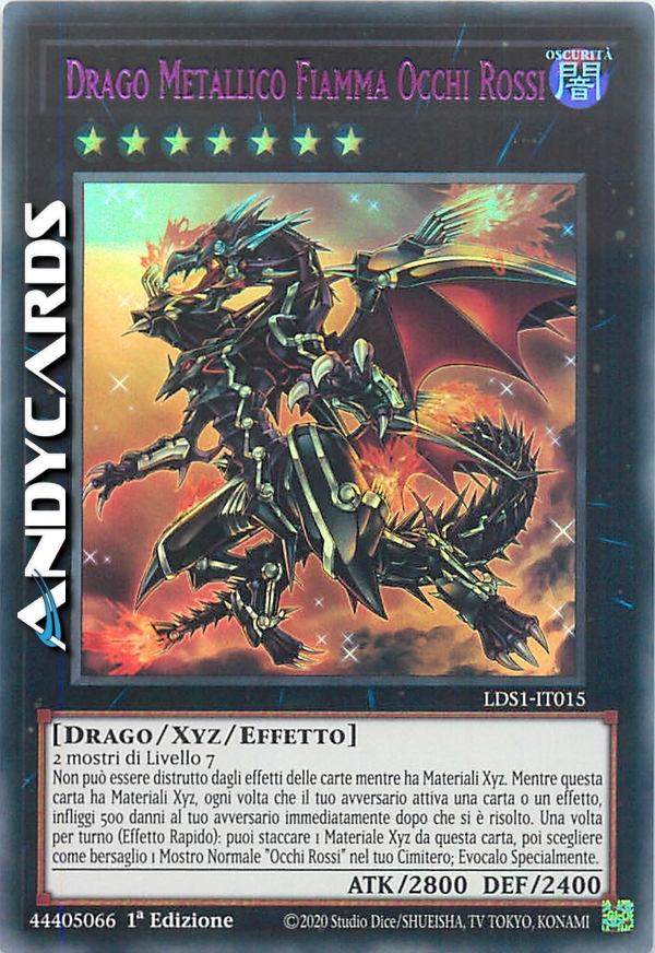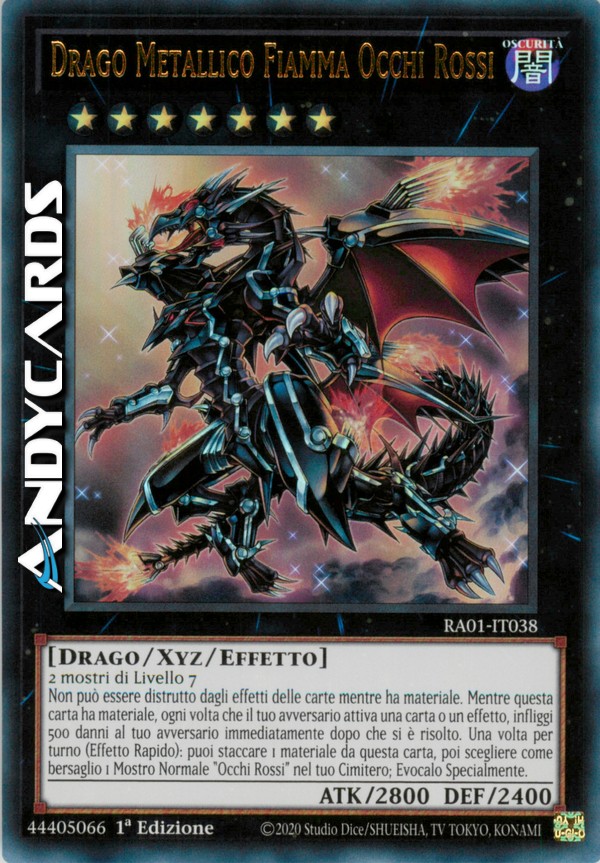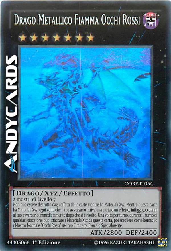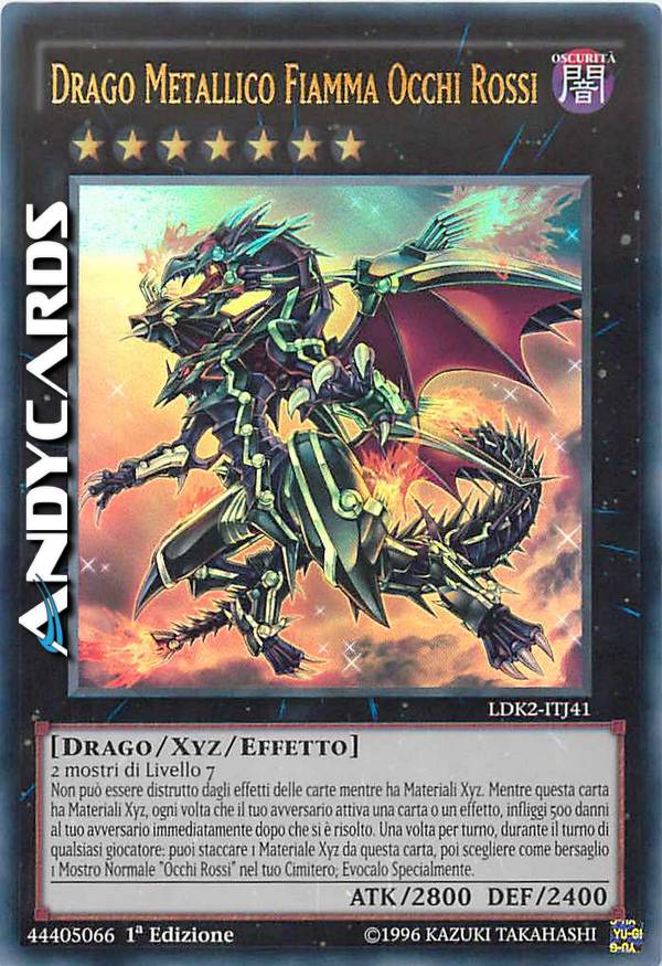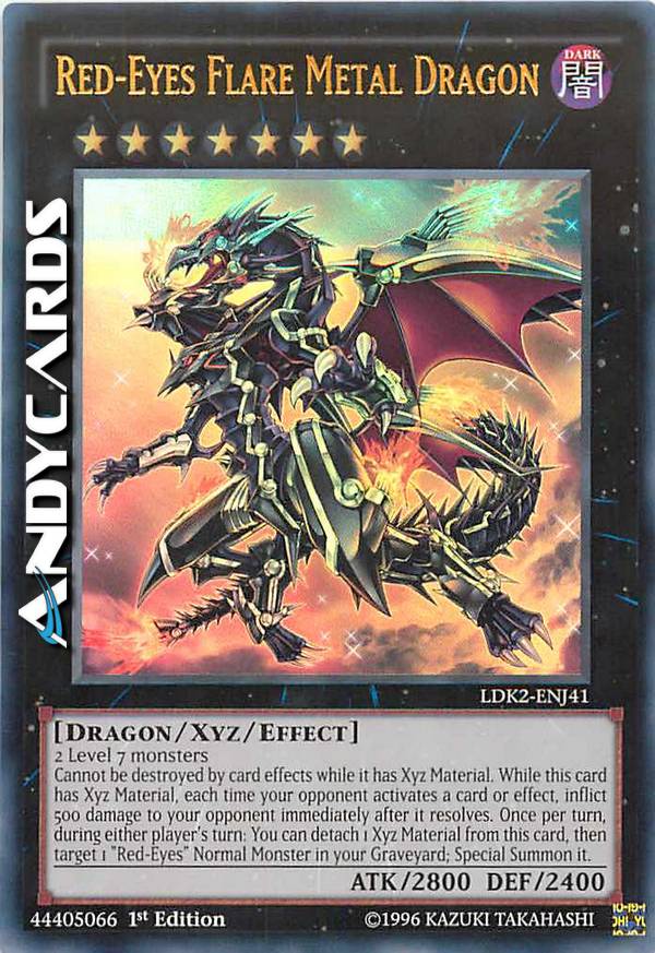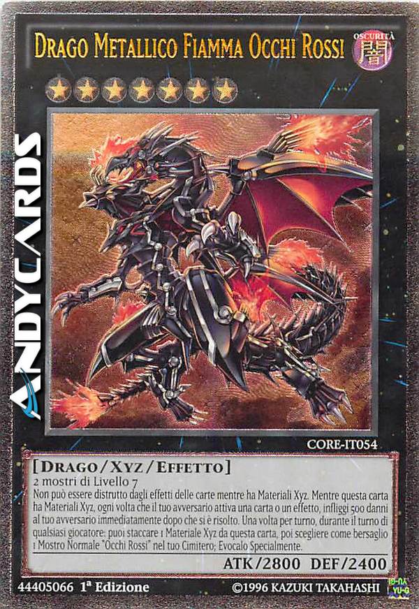 2 mostri di Livello 7 Non può essere distrutto dagli effetti delle carte mentre ha Materiali Xyz. Mentre questa carta ha Materiali Xyz, ogni volta che il tuo avversario attiva una carta o un effetto, infliggi 500 danni al tuo avversario immediatamente dopo che si è risolto. Una volta per turno, durante il turno di qualsiasi giocatore: puoi staccare 1 Materiale Xyz da questa carta, poi scegliere come bersaglio 1 Mostro Normale "Occhi Rossi" nel tuo Cimitero; Evocalo Specialmente.