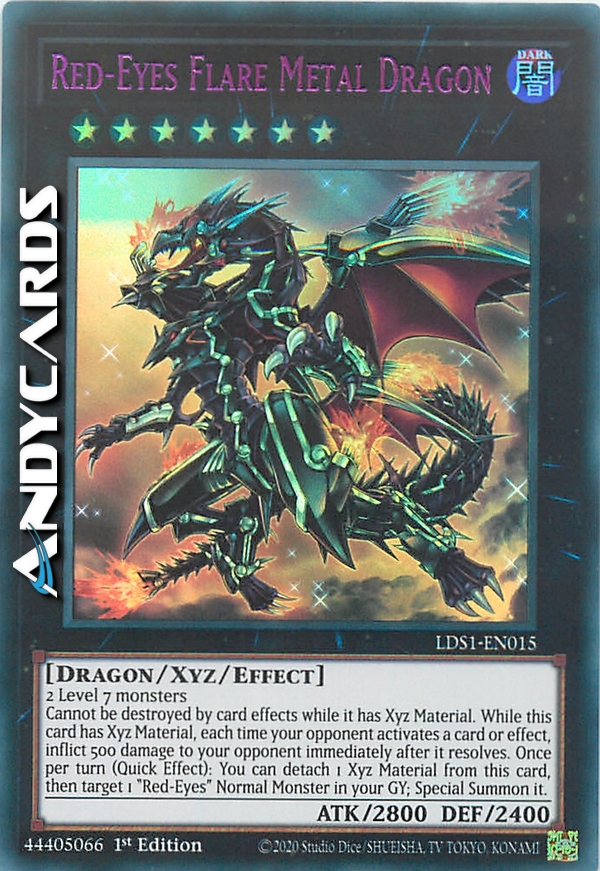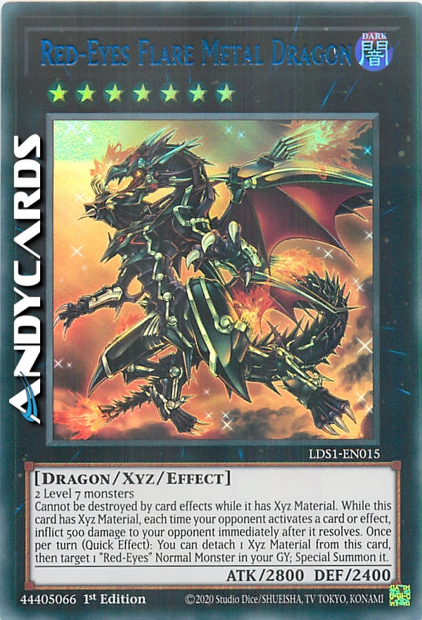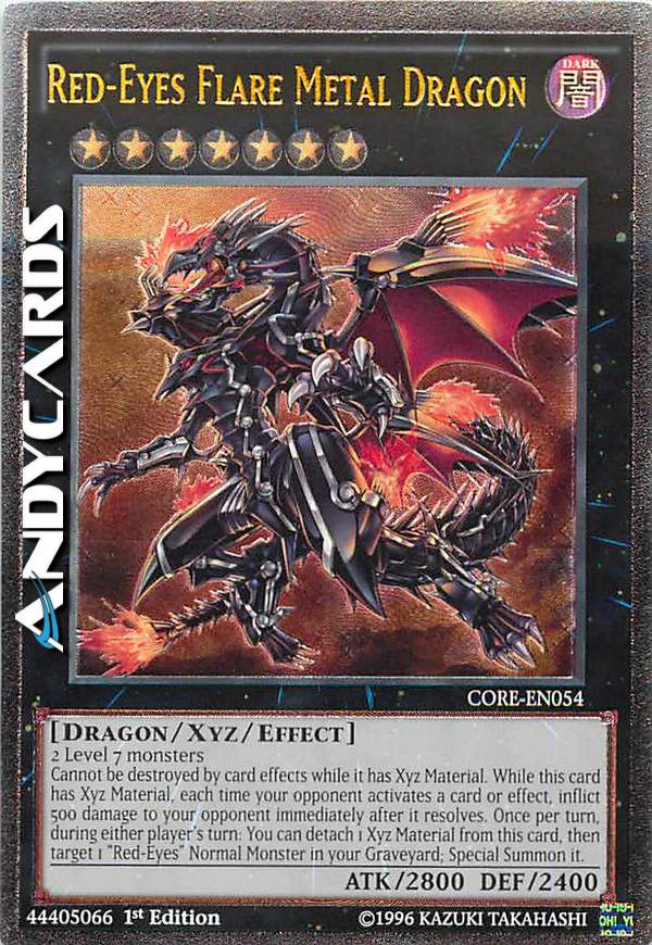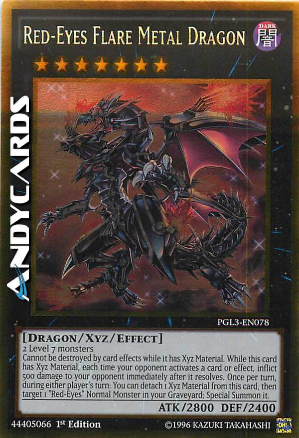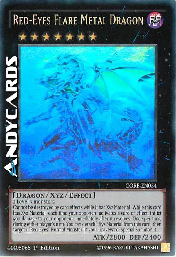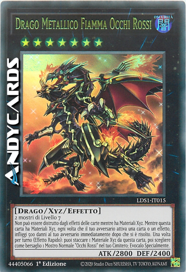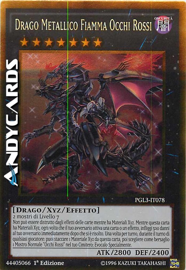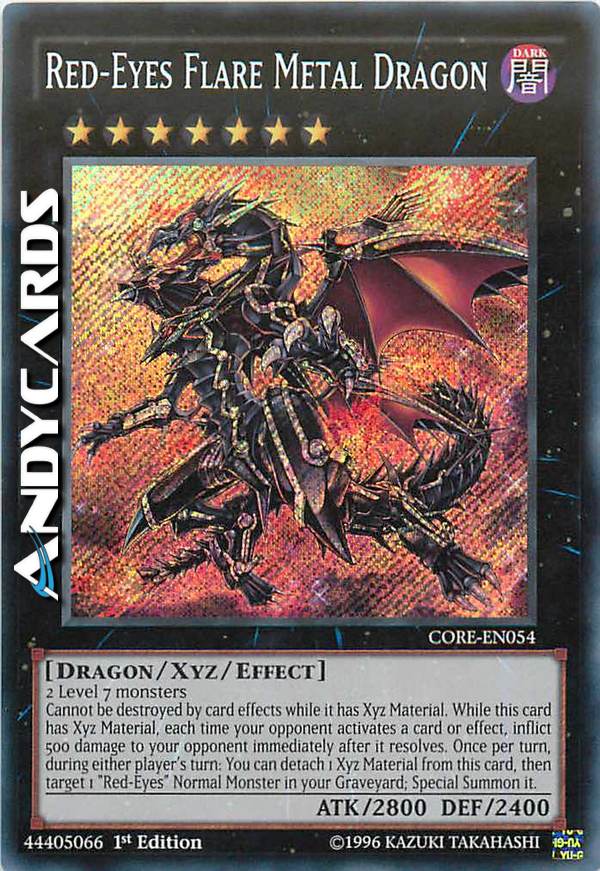 2 mostri di Livello 7 Non può essere distrutto dagli effetti delle carte mentre ha Materiali Xyz. Mentre questa carta ha Materiali Xyz, ogni volta che il tuo avversario attiva una carta o un effetto, infliggi 500 danni al tuo avversario immediatamente dopo che si è risolto. Una volta per turno, durante il turno di qualsiasi giocatore: puoi staccare 1 Materiale Xyz da questa carta, poi scegliere come bersaglio 1 Mostro Normale "Occhi Rossi" nel tuo Cimitero; Evocalo Specialmente.